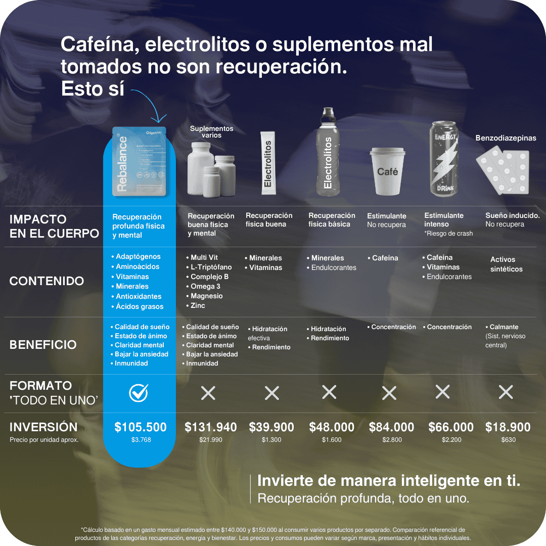 Rebalance apoya el rendimiento sin estimulantes, favoreciendo el equilibrio del organismo, la recuperación profunda y la capacidad de sostener el esfuerzo físico y mental.